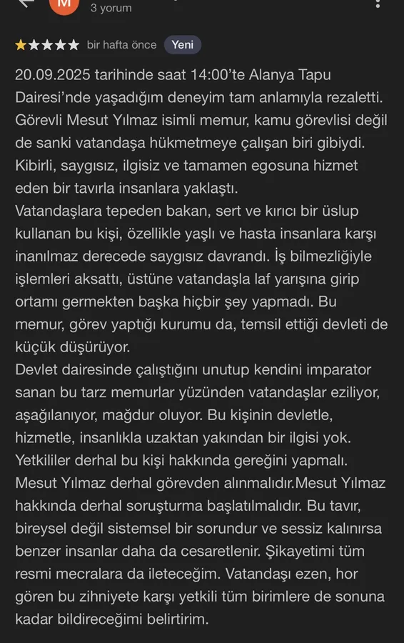 Yorumlarda adı sıkça geçen Mesut Yılmaz adlı görevli hakkında onlarca şikayet bulunuyor.