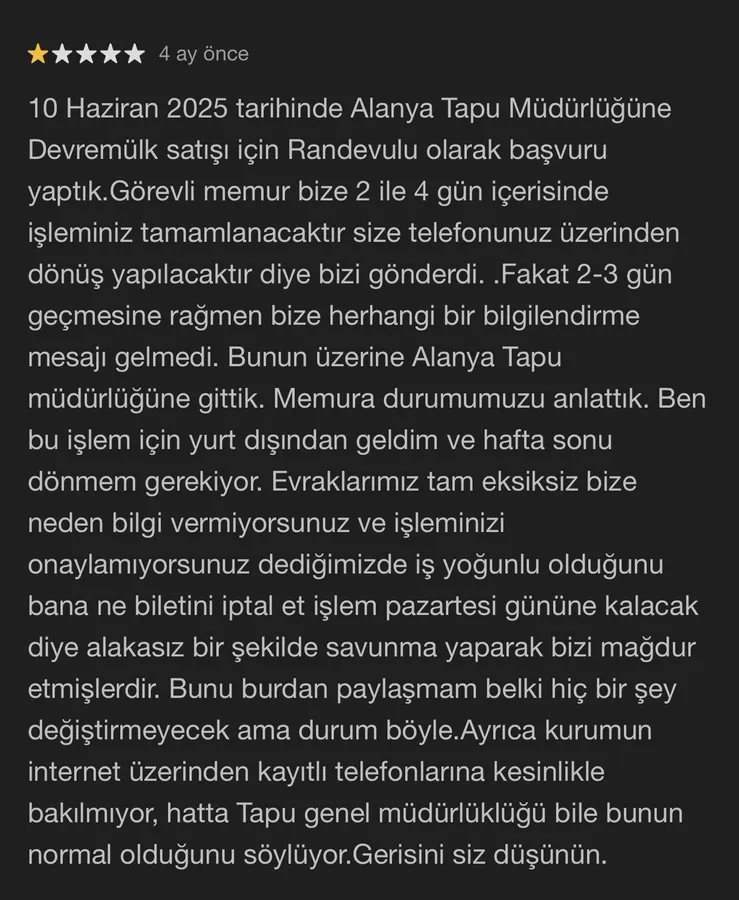 Alanya Tapu Müdürlüğü’ne yönelik art arda gelen şikayetler, hem vatandaşın mağduriyetini hem de kamu kurumlarında denetim eksikliğini gündeme taşıdı.